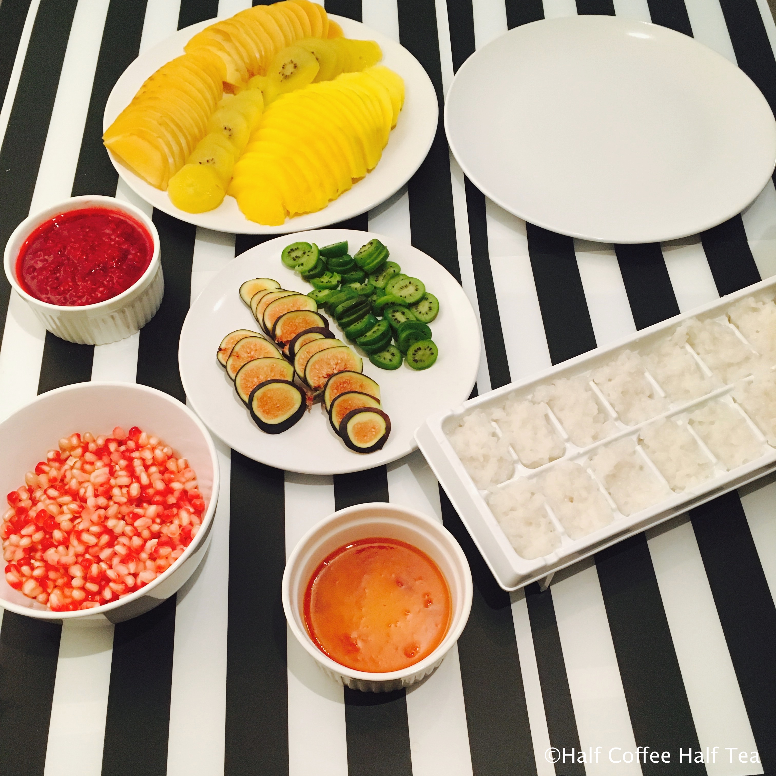 - Take out the rice mixture from the ice tray one at a time, shape them into ovals and flatten the tops. Arrange the sliced fruit on the top. Feel free to be creative. 😉